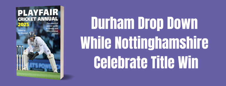 It was a similar story at Derby where only one day’s play took place. Glamorgan were put in to bat and Kiran Carlson scored 94. The Welsh side was eventually all out for 259, Luis Reece taking four for 67. Derbyshire had also made 17 without loss when the game ended; Amrit Basra made his first-class debut for them, but didn’t bat or bowl. The draw was enough to secure promotion for Glamorgan, back in the top flight after 20 years.